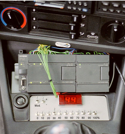 Allerdings stellte sich heraus das der Regler mit ca.100ms Zykluszeit zu langsam ist. Bei schnellen Gangwechseln gab es starke Rucke. Zum Umrechnen habe ich nun eine SPS von SIEMENS drin, die habe ich bei e-bay “geschossen” und die Programmierung ist recht einfach. Vielleicht hätte es aber auch eine C-Control von Conrad Electronic getan. Die kostet nur einen Bruchteil der SIMATIC hat aber nur 8Bit Wandler und ist vielleicht nicht schnell genug. Ausserdem glaube ich das die SIMATIC robuster ist. Die Zykluszeit liegt jetzt bei 3ms und das Auto läuft recht gut.