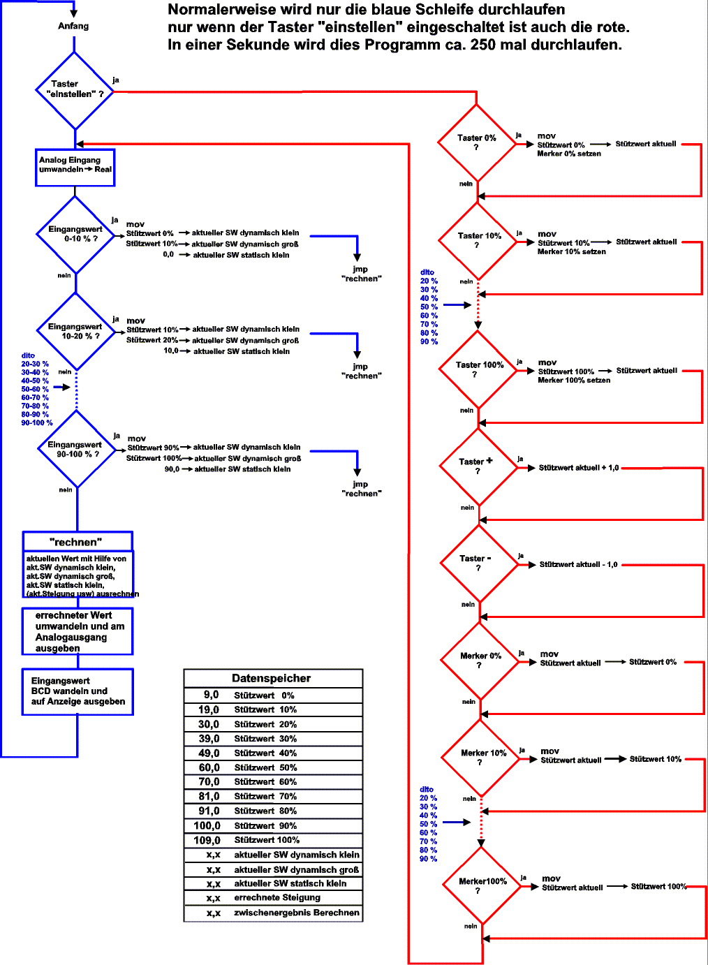 Die Kurve welche die SPS umrechnet hat elf Stützpunkte 0-100% mit den +/- Taster kann man jetzt, während der Fahrt, jeden einzelnen Stützpunkt einstellen, im